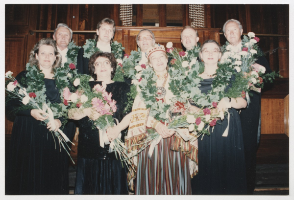 Annotation: Austrālijas Latviešu 39. Kultūras dienu diriģenti ar ziediem, pēc kopkora koncerta. No kr.: 1.r. Daina Jaunbērziņa, soliste Stella Aksarle, Ruta Brože, Astra Konīte; 2.r. Ēriks Ozoliņš, Kārlis Beinerts, Viktors Bendrups, Juris Balodis, Haralds Rutups. Melburnas Latviešu nama zāle, 1989.g. 30.decembris. Foto: nezināms. |