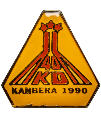 Annotation: Sešstūra formas, ar caurspīdīgu lakas kārtu pārklāta dzeltena piespraude, uz kuras ar sarkanu atveidotas trīs zvaigznes, zem tām stilizētas formas divi stari, kuru pamatā Latvijas karogs. Centrā uzraksts "40 KD", zemāk zelta krāsas burtiem uzraksts "Kanbera 1990". Gatavota Austrālijas latviešu 40.kultūras dienām Kanberā 1990.gadā. Rv. piestiprināta horizontāla piespraude. |