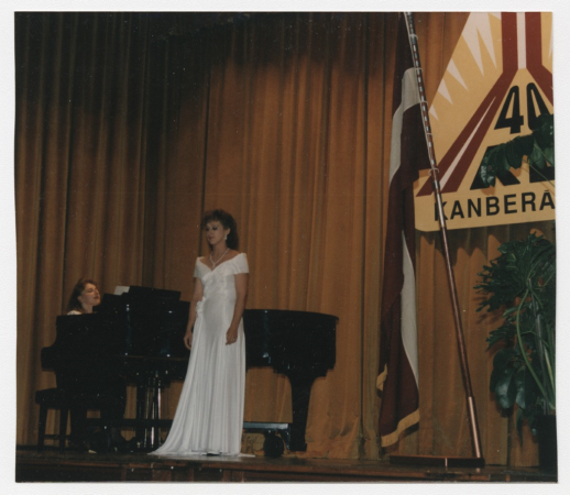 Annotation: Uzstājas dziedātāja Lilija Sīle, pie klavierēm Terēze Rozenberga (abas no Latvijas). Kanbera, Alberta Halle, 1990.g. 26.decembris. Foto: nezināms. |