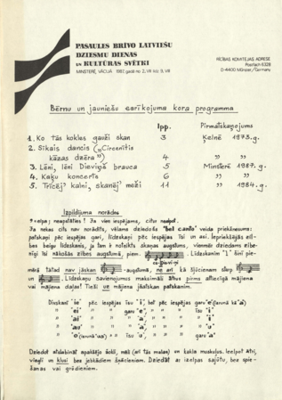 Bērnu un jauniešu sarīkojuma kora programma : pasaules brīvo latviešu dziesmu dienas un kultūras svētki Minsterē, Vācijā Vītoliņš, Andris, 1931-2013 Annotation: Saturs : Ko tās kokles gauži skan ; Sīkais jeb gatvu dancis no Alšvangas ; Lēni, lēni Dieviņš brauca ; Kaķu koncerts ; Trīcēj' kalni, skanēj' meži. |