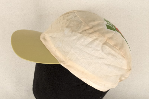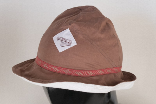 Annotation: CEPURE ar XXI Vispārējo latviešu dziesmu svētku emblēmu. [Latvija, 1993.gada jūnijs; svētki notika no 27.jūnija līdz 4.jūlijam]. Piederējusi svētku virsdiriģentam Leonīdam Vīgneram. Panamas tipa cepurīte, šūta no gaiši brūna kokvilnas auduma, iekšpusē - balta kokvilnas auduma odere. Cepures vidusdaļā visapkārt piešūta sarkana tautiska prievīte. Priekšpusē piešūts balts kvadrāta formas audums ar gaiši brūnu apdruku - XXI Vispārējo latviešu dziesmu svētku emblēma ar uzrakstu "XXI Vispārējie latviešu dziesmu svētki - 1993". |