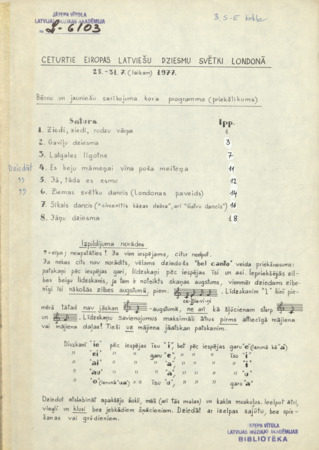 Ceturtie Eiropas Latviešu Dziesmu svētki Londonā : Bērnu un jauniešu sarīkojuma kora programma (priekšlikums) Vītoliņš, Andris, 1931-2013 Annotation: Kora dziesmu krājumā apkopoti A. Vītoliņa skaņdarbi Ceturto Eiropas Latviešu Dziesmu svētku Londonā bērnu un jauniešu kora koncerta programmai |