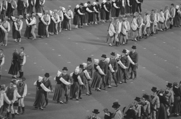 Dejotāju un fizkultūriešu kolektīvu dalībnieku parāde stadionā "Daugava" XII Vispārējo latviešu Dziesmu svētku un III Deju svētku laikā Array