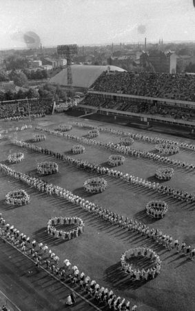 Deju kolektīvu koncerts stadionā "Daugava" XVIII Vispārējo latviešu Dziesmu un Deju svētku laikā Pāže, Uldis, 1950-