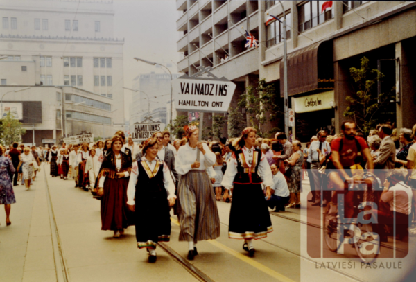 Annotation: Hamiltonas Daugavas Vanagu tautas deju kopa "Vainadziņš" piedalās 7. Latviešu Dziesmu svētku gājienā Toronto, Kanādā, 1981. gadā. No kreisās: Baiba Šmita-Kalēja, Velta Dāboliņa, Anda Avena (ar plakātu), Ingrīda Kuncāne. |