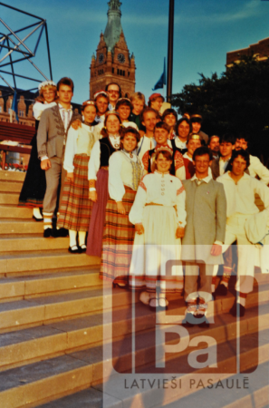 Annotation: Hamiltonas Daugavas Vanagu tautas deju kopa "Vainadziņš" Vispārējo latviešu Dziesmu svētku laikā pie Milvoku rātsnama, ASV, 1983. gadā. |