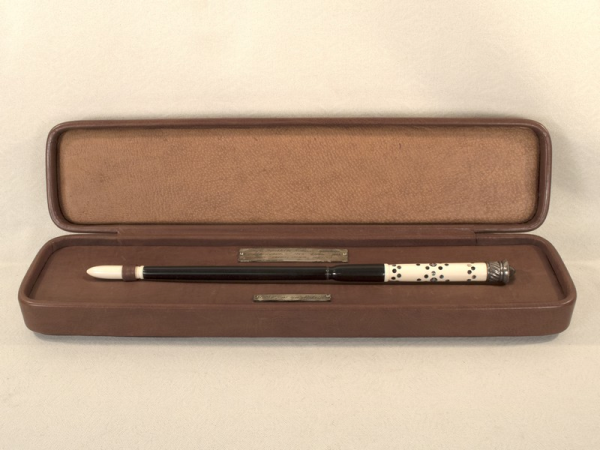 Annotation: Diriģenta zizlis (Teodora Reitera zižļa kopija) - Latvijas Republikas Kultūras ministrijas ceļojošā Dziesmu svētku balva par izciliem sasniegumiem mūzikā. Pasniegta Haraldam Mednim 1993.gada 4.jūlijā. Materiāli: koks, ziloņkauls, sudrabs, āda. Zizlis veidots no melnkoka. Galā sašaurināts. Ar inkrustētu cilindra formas rokturi no ziloņkaula, kuram noskrūvējams sudraba gals ar iesistām zīmēm "... 84 LD". Zižļa uzgalis no ziloņkaula, lāses formā ar smailu galu. Ievietots brūnā ādas oriģinālkārbā, kuras iekšpusē pieskrūvētas 2 sudraba plāksnītes ar iegravētu tekstu (balvas nosaukums, gads un saņēmējs). + Latvijas Kultūras ministra Raimonda Paula parakstīts pavadraksts (skat. pie Dok.). |