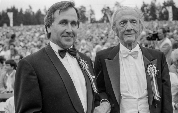 Diriģenti Leonīds Vīgners (no kreisās) un Teodors Kalniņš XIII Vispārējos latviešu Dziesmu svētkos Mežaparka Lielajā estrādē