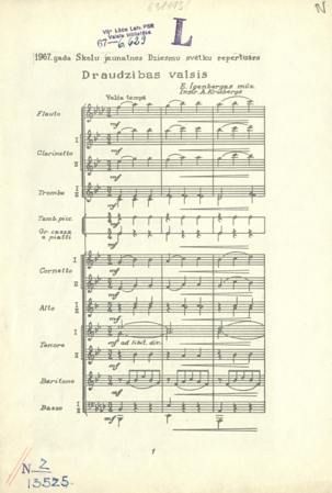 Draudzības valsis Īgenberga, Elga, 1921-2003 Annotation: Pūtēju orķestra partitūra |