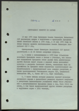 Dokumenti un sarakste par LPSR Ministru padomes 1971. gada 20. maija lēmuma Nr. 243 "Par 1973. gada Padomju Latvijas Dziesmu svētku sagatavošanos un vadīšanu" izpilde