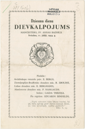 Dziesmu dienu dievkalpojums : Mančesterā, Sv. Annas baznīcā svētdien, 11 jūlijā, 1954. g.