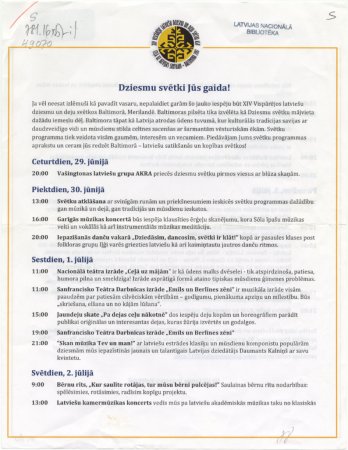 Dziesmu svētki 16. un 17. jūnijā 1923.g. Rīgā Lapiņš, Mārtiņš, 1873-1954 Annotation: Dziesmu dienas Rīgā, Esplanādē, tika rīkotas par godu Dziesmu svētku 50 gadadienai. |