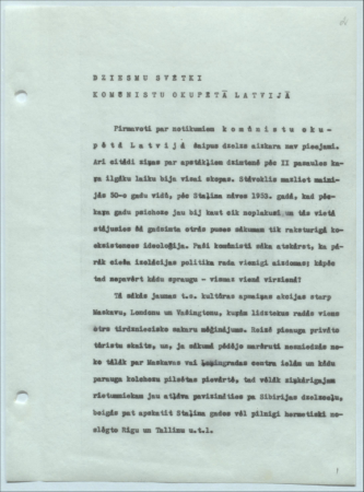 Dziesmu svētki komunistu okupētā Latvijā Bērzkalns, Valentīns, 1914-1975 Annotation: Fragments no trimdas latviešu mūzikas vēsturnieka, komponista un mūzikas pedagoga V. Bērzkalna latviešu dziesmu svētku vēstures pētījuma. |