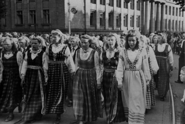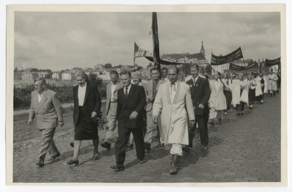 Dziesmu svētku gājiens Legzdiņš, Žanis, 1915-1991 Annotation: [? Rīgas pilsētas Molotova rajona] Dziesmu svētku gājiens [uz Mežaparku]. Rīga, 1950.g. [18.jūnijs]. Priekšplānā no kr. komponists Nilss Grīnfelds, 2.r. no labās virsdiriģents Krišs Deķis, 2.[Ēvalds Skudra]. Foto: Žanis Legzdiņš. /Pasākums, gaidot Padomju Latvijas II Dziesmu svētkus. Dziesmu svētku kopkora koncerti un galvenie pasākumi 1950.gadā notiek Esplanādē/. |