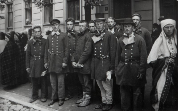 Annotation: Etnogrāfiskā ansambļa "Ventiņi" dalībnieki Rīgas ielās VIII latvju vispārējo Dziesmu svētku laikā |