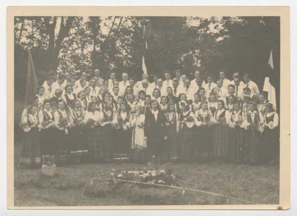Annotation: Fišbahas dziesmu svētku atskaņu koncerta dalībnieki Bābenhauzenas parkā (Vācija). Centrā, tumšā kostīmā diriģente - Meta Muižarāja (dz.Vīgnere, 2.laulībā Krišjāne). 1948. gada septembris. Foto: J.Princis, Babenhausen/Hessen, D.P. Camp. |