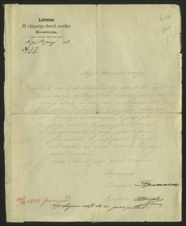 Ielūgums Krišjānim Valdemāram uz III. Vispārējiem dziesmu svētkiem