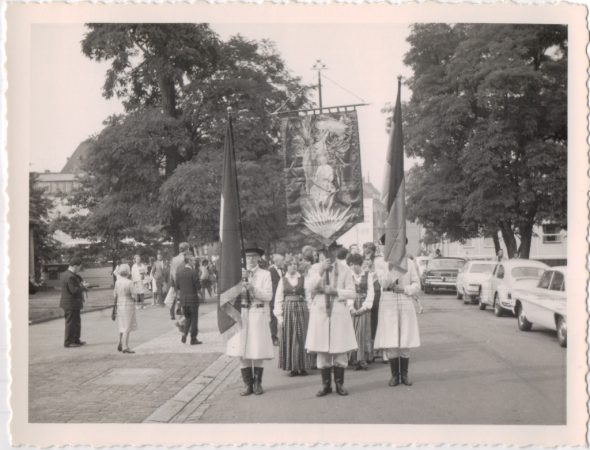 Annotation: Dziesmu svētku dalībnieku gājiens ar dziesmu svētku karogu.