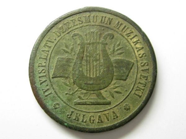 Annotation: IV Vispārējo latviešu dziesmu svētku piemiņas MEDAĻA. Svētki notika Jelgavā, 1895. gada 15.-18. jūnijā. Av.: centrā lira, aiz tās atvērta nošu burtnīca un sakrustoti divi lauru zari. Apkārt pa perimetru uzraksts "IV. VISP. LATV. DZESSMU UN MUZIKAS SVETKI / JELGAVA". Rev.: centrā uzraksts "LATVJU TAUTA / DZEEDATAJA, / DZEESMU GARS / PĀR TEV' LAI / PLŪST! / 1895". Virs uzraksta piecstaru zvaigzne, sānos - divi ozola zari, kas apakšā centrā sasieti ar lentu. Jelgava, 1895.g. Varš. |