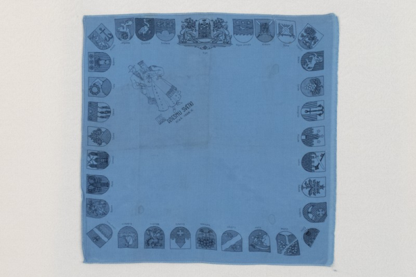 Annotation: IX Vispārējo latviešu dziesmu svētku piemiņas LAKATIŅŠ. 1938. gads (svētki notika 18.-19. jūnijā). Zils zīda audums, apdrukāts: centrālās daļas stūrī svētku emblēma - vīrietis un sieviete tautas tērpos, zem tās uzraksts "IX / LATVIEŠU / DZIESMU SVĒTKI / RĪGĀ 1938. G." Gar malām - Latvijas pilsētu ģerboņi: Rīga, Rīgas jūrmala, Alūksne, Sloka, Liepāja, Ilūkste, Sabile, Salacgrīva, Aizpute, Ludza, Subate, Ventspils, Cēsis, Durbe, Valka, Kuldīga, Valmiera, Krustpils, Rēzekne, Krāslava, Daugavpils, Bauska, Auce, Limbaži, Tukums, Piltene, Talsi, Rūjiena, Ainaži, Jelgava, Grobiņa, Smiltene. |