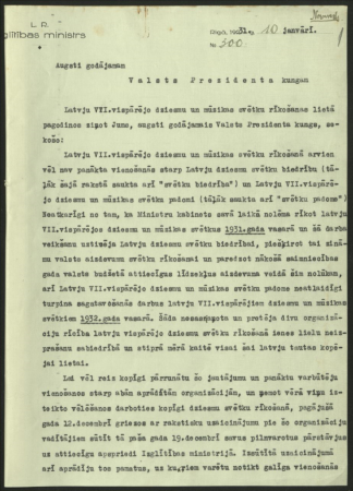 Izglītības ministrijas raksti Valsts prezidentam, VII Vispārējo dziesmu un mūzikas svētku padomei par svētku organizēšanu
