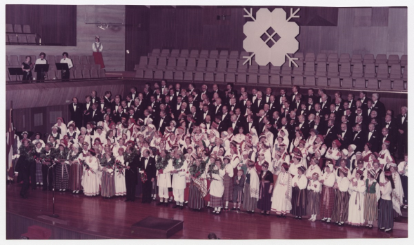 Annotation: Austrālijas Latviešu 33. Kultūras dienas. Kopkora koncerta noslēgums. Priekšā soliste Stella Aksarle, virsdiriģenti Staņislavs Līvmanis, Viktors Bendrups, Daina Jaunbēziņa, Imants Mežaraups, Arvīds Purvs, Astra Kronīte, Ēriks Ozoliņš, Haralds Rutups. Melburna, 1983.g. 30.decembris. Foto: nezināms. |
