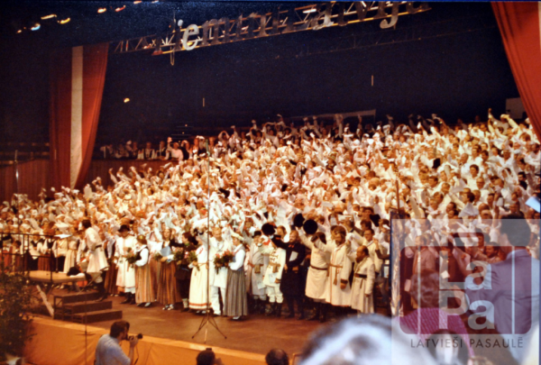 Annotation: Apvienoto koru dižuzvedums "No Dikļiem līdz Minsterei" Pasaules brīvo latviešu Dziesmu dienās Halle Münsterland Lielajā zālē, Minsterē, Vācijā, 1984. gada 3. augustā. |