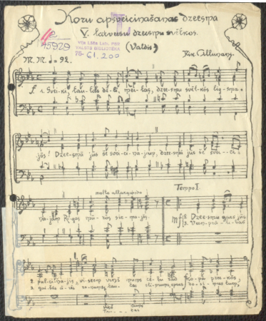 Koru apsveicināšanās dziesma : 5. latviešu dziesmu svētkos Alunāns, Nikolajs, 1859-1919