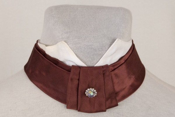 Annotation: KRAVATE, virsdiriģenta tērpa daļa. Izgatavota XVI vispārējo (simtgades) latviešu dziesmu svētku virsdiriģentiem. Rīga, 1973.gads (svētki notika no 15.līdz 22.jūlijam). Ap kaklu liekams rotājums (kaklasaites, tauriņa vietā), šūts no brūna zīda auduma, centrā dubultieloce un daudzšķautņaina stikla pērlīte, kuru ietver 12 mazas baltas plastmasas pērlītes. Augšējā malā krekla apkakles stūrīši no balta zīda auduma. Galos aizdare ar diviem metāla āķīšiem. |