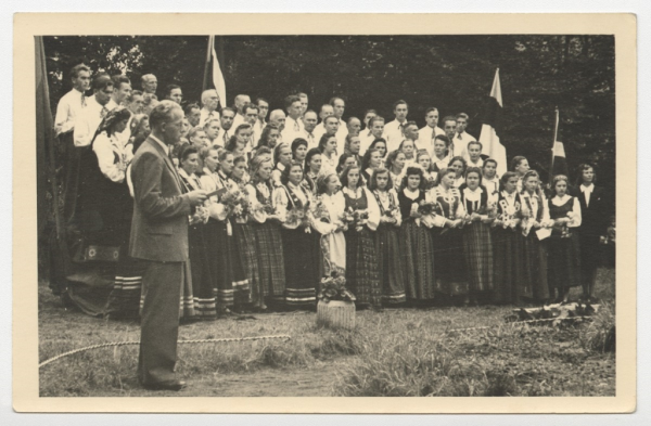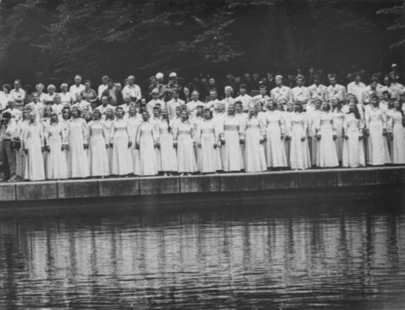 Annotation: Fišbahas dziesmu svētku atskaņu koncerta dalībnieki Bābenhauzenas parkā (Vācija). Labajā malā tumšā kostīmā diriģente Meta Muižarāja (dz.Vīgnere, 2.laulībā Krišjāne). 1948. gada septembris. Foto: nezināms. |