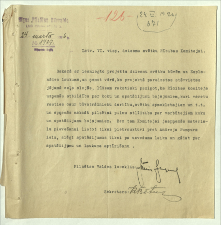 Annotation: Rīgas pilsētas būvvaldes sarakste ar 6. Vispārējo latviešu dziesmu svētku Rīcības komiteju. |