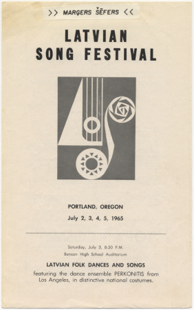 Annotation: Programma angļu valodā no "Latvian Song Festival" Portlandā, Oregonā, 1965. gadā. Īss apraksts par dziesmu svētkiem un Latviju. Aizmugurē Marģera Šēfera ekslibris. |