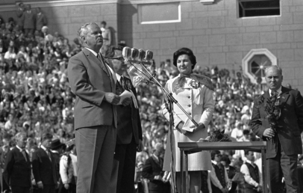 Latvijas PSR Ministru padomes priekšēdētāja vietnieks Vilis Krūmiņš sveic XVI Vispārējo latviešu Dziesmu svētku laureātus Mežaparka Lielajā estrādē Nikolajevs, Vladimirs, 1927-1976