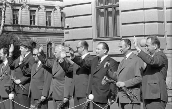 Latvijas republikas augstākās amatpersonas sveic XVI Vispārējo latviešu Dziesmu un VII Deju svētku gājiena dalībniekus Array Annotation: No kreisās: 2. Latvijas PSR Ministru Padomes priekšsēdētājs Jurijs Rubenis, 3. Latvijas Komunistiskās partijas Centrālās komitejas 1. sekretārs Augusts Voss, 4. Latvijas PSR Augstākās Padomes Prezidija priekšsēdētājs Pēteris Strautmanis, 5. Latvijas Komunistiskās partijas Centrālās komitejas 2. sekretārs Nikolajs Beluha |