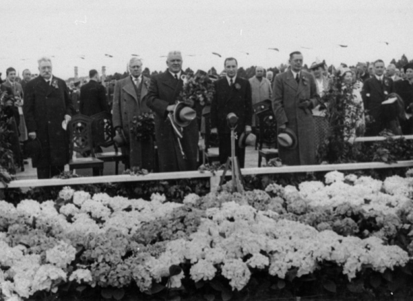 Annotation: Centrā no labās cepurēs: 1. kara ministrs Jānis Balodis, 2. Latvijas Valsts un Ministru prezidents Kārlis Ulmanis, 3. sabiedrisko lietu ministrs Alfrēds Bērziņš, 4. izglītības ministrs Augusts Tentelis |