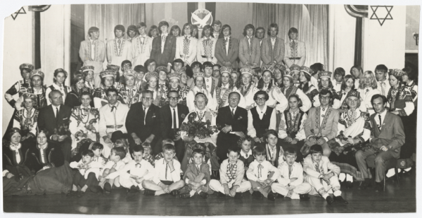 Annotation: Līdsas Daugavas Vanagu nodaļas rīkotie gadskārtējie deju svētki (notika vienmēr rudenī). ~1967. gadā, Līdsā, Jubilee Hall. Piedalās: Bradfordas Sakta, Līdsas Kamoliņš, Korbijas Pērkonītis. Londonas kopa, otrā rinda sēž (no kreisās): ?, ?, Zigrīda Daškevica, Jānis Šmits, Rihards Pureniņš, Alberts Jērums, Vera Rulliņa, Jānis Pētersons (DV Līdsas nodaļas ilggadējais priekšsēdētājs), Anna Krieviņa (Līdsas DV priekšsēdētāja), ?, Viktors Grigulis, Ilga Mieriņa, Karlis Uskalis. 2. pusē fotogrāfa zīmogs: "A.E.Balodis Photographer 12 Spennithorne Drive". |