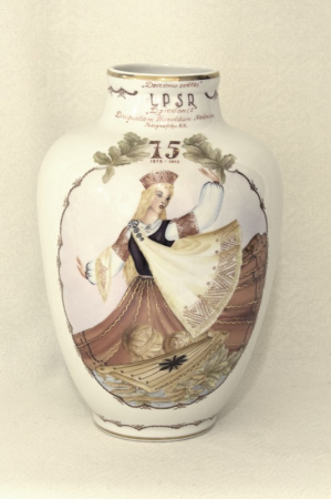 Annotation: Lietišķā māksla, keramika, dekoratīva vāze. A.Grūbe. Dekoratīva apgleznota vāze, Rīgas keramikas fabrikas izstrādājums. Vīru kora "Dziedonis" dāvinājums H.Mednim Dziesmu svētku 75.gadadienā. 1948.gada jūlijs. Porcelāns, glazējums, zeltījums, polihroms virsglazūras gleznojums. Autora uzraksts "Rokdarbs. / A. Grūbe / 1948.g.VII" uz vāzes pamatnes. Uzraksts ""Dziesmu svētki" / LPSR / "Dziedonis" / Diriģentam Haraldam Mednim / Poligrafiķu R.K." uz vāzes kakla. |