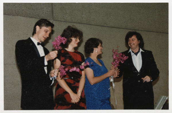 Annotation: Austrālijas Latviešu 38. Kultūras dienas. Pēcpusdienas (kamermūzikas) koncerta dalībnieki (no kr.) baritons Pauls Berkolds, pianistes Ingrīda Rinna, Māra Birzaite, Edgars Kariks (kamerorķestra vadītājs). Brisbena, 1988.g. 29.decembris. Foto: nezināms. |