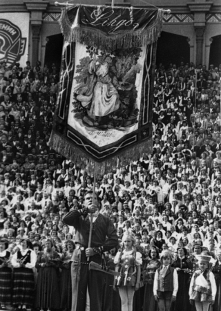 Pirmo latviešu Dziesmu svētku karogs XVIII Vispārējo latviešu Dziesmu un Deju svētku atklāšanā Mežaparka Lielajā estrādē