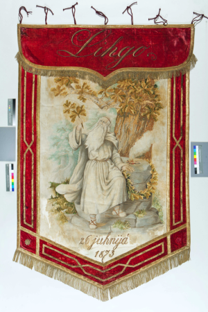 Annotation: Pirmo Vispārējo latviešu Dziedāšanas svētku jeb Līgo karogs. Izgatavots Leipcigā, J. A. Hītela (Hietel) karogu darbnīcā pēc Rīgas Latviešu biedrības pasūtījuma 1873.gadā. Iespējams, pēc Baumaņu Kārļa zīmējuma. |