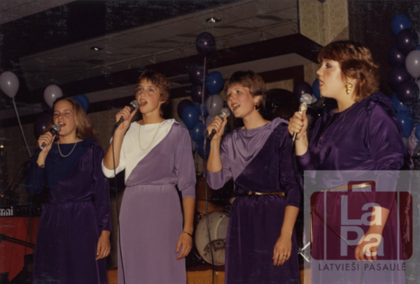 Portlandes ansambļa "Dzintars" dziedātājas Elstiņš, Emīls Edgars, 1920-2015 Annotation: 9. Rietumkrasta Dziesmu svētki ASV Portlendas, Oregonā, ASV no 1982. gada 30. jūnija līdz 5. jūlijam. Uzstājas Portlendas ansambļa "Dzintars" dziedātājas. No kreisās: Māra Zommere, Andra Zommere, Ilga Eglīte, Inta Kurmiņa. |
