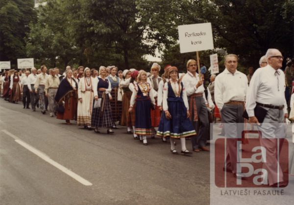 Portlendas koris 9. Rietumu krasta latviešu Dziesmu svētku gājienā Elstiņš, Emīls Edgars, 1920-2015 Annotation: 9. Rietumkrasta Dziesmu svētki Portlendā, Oregonā, ASV no 1982. gada 30. jūnija līdz 5. jūlijam. Portlendas koris svētku gājienā. Plakātu nes Alberts Ritmanis. |